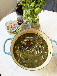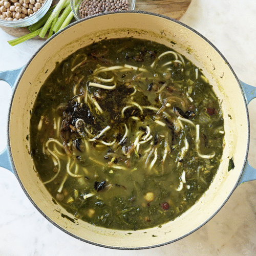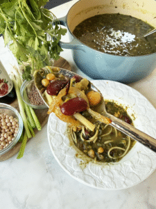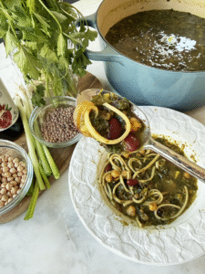 A hearty Persian noodle soup made with fresh herbs, beans, lentils, and reshteh noodles, finished with a sweet-tart drizzle of pomegranate molasses instead of kashk. Comforting, nourishing, and full of bright, savory flavor.