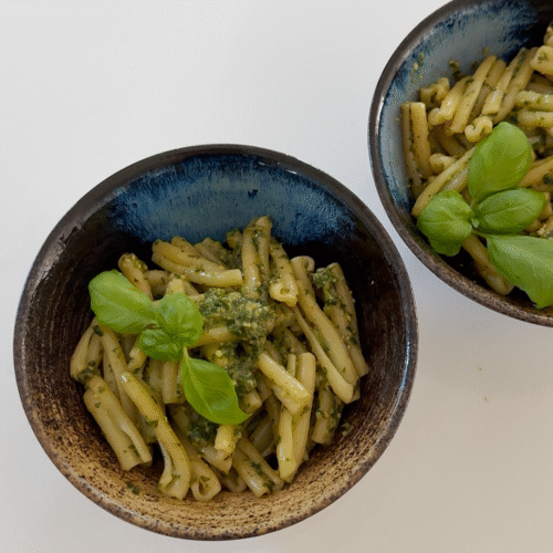 This is my go-to flavor hack, a simple basil pesto that I make once a month and freeze in small containers. It’s bright, garlicky, and adds instant freshness to pasta, eggs, veggies, or anything that needs a quick boost of flavor.