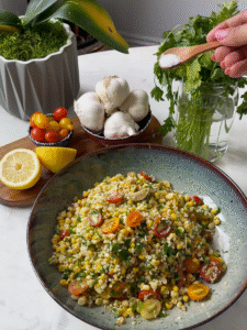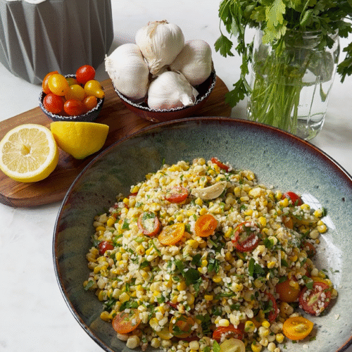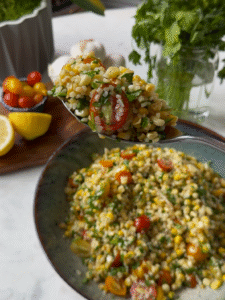 A bright, summery salad made with charred corn, tender bulgur, and fresh herbs. Tossed with cherry tomatoes, garlic, and lemon juice, it’s light, flavorful, and perfect as a side or simple meal.