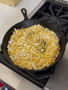 • Heat olive oil in a large cast iron pan over heat. Add corn kernels and sliced garlic and cook about 5-6 minutes. Let the corn char undisturbed for a bit to get good color, but stir once or twice, until cooked all around.