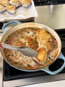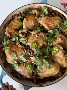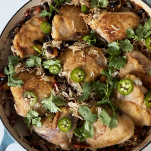 There’s nothing quite like a one-pan meal to make dinner feel effortless. This chicken and rice skillet is everything I want at the end of a long day: hearty, flavorful, and comforting without being fussy. Juicy chicken thighs get seared until golden, then simmered with peppers, onions, black beans, and fragrant spices before baking to perfection. The best part? Everything comes together in a single pan, so cleanup is minimal and the flavors are maximized. Whether you’re feeding your family on a weeknight or looking for a cozy dish to share with guests on Shabbat, this recipe is sure to become a regular at your table.