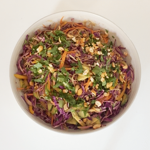 This crunchy veggie salad with spicy peanut dressing is the kind of recipe you’ll crave when you want something fresh, colorful, and deeply satisfying without being heavy. Packed with purple cabbage, crisp cucumbers, sweet bell peppers, and peppery watermelon radish, it’s a veggie-forward salad with just a little bit of soba noodles for balance. Everything gets tossed in a creamy, spicy peanut dressing that ties it all together. Perfect for easy lunches, meal prep, or a vibrant side dish that steals the show.