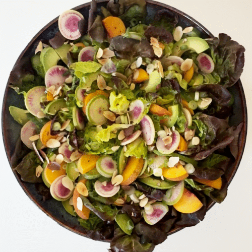 This fresh and vibrant salad pairs crisp little gem lettuce with cucumbers, avocado, juicy peaches, radishes, green onions, and toasted almonds for crunch. The real star is the creamy tahini dressing made with olive oil, tahini, lemon juice, white wine vinegar, dijon mustard, garlic, honey, and dried mint. It ties everything together with a tangy-sweet, nutty flavor. Perfect for summer meals, light lunches, or as a colorful side dish.