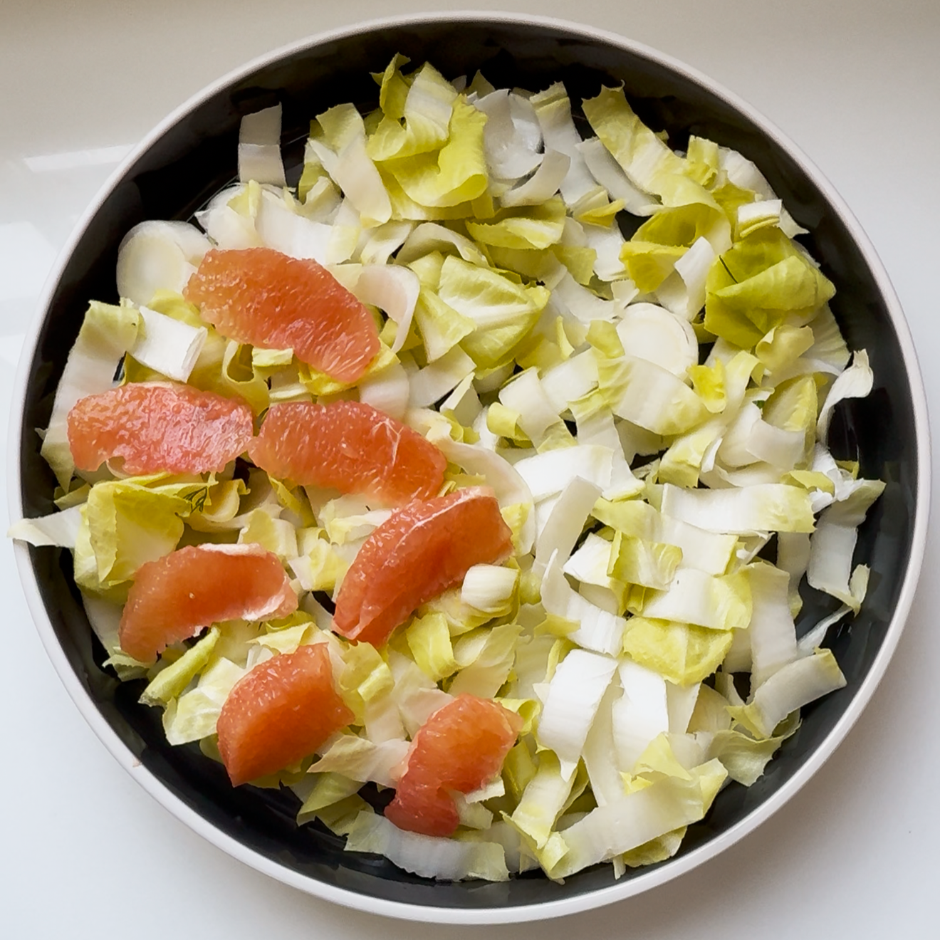 - Arrange endive on a large plate. Follow with grapefruit segments and avocado pieces on top. Artfully add the mint leaves and hazelnuts. Top with a generous sprinkle of Maldon salt and spoon the dressing on top. Serve immediately. There you have a quick and delicious summer salad!
