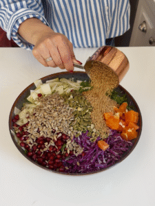 • To a large mixing bowl add cabbage, fennel, kohlrabi, mint, cilantro, pomegranate, oranges and all the seeds.