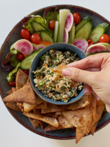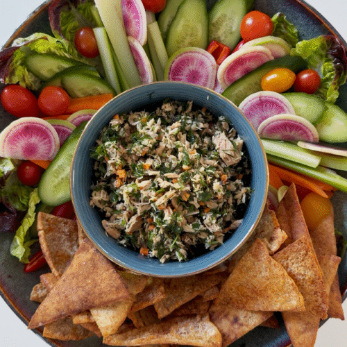 This Game Day Tuna Salad + Pita Chips is my go-to when I want something that feels fresh and satisfying without being heavy. The tuna salad is mayo-free (because, truthfully, I can’t stand the stuff!) and instead gets its tang and creaminess from mustard, crunchy veggies, and fresh herbs. The homemade pita chips bake up golden and crisp in just a few minutes, and when you pair everything with plenty of crunchy, fresh veggies, you’ve got a snack plate that’s equal parts colorful and craveable.