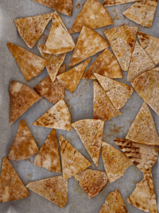 - Preheat oven to 425°. Split pitas down the middle and cut each half into 8 equal triangles. Drizzle pita with olive oil, season with salt and paprika and mix well, being careful not to break the pieces. Lay the pieces on a parchment lined sheet tray in an even layer. Bake for 5-10 minutes. Let cool before storing.