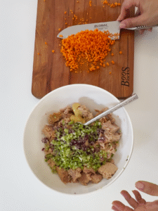 - Drain cans of tuna and place into a bowl with dijon mustard, red onion, carrots, celery, parsley and dill. Season with salt and pepper, drizzle with olive oil and mix well.