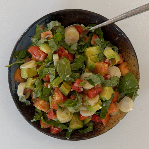 A vibrant, refreshing salad that celebrates late-season produce. Juicy heirloom tomatoes, creamy avocado, tender hearts of palm, and fragrant basil are lightly seasoned and tossed in a bright shallot vinaigrette. Simple, fresh, and perfectly balanced.
