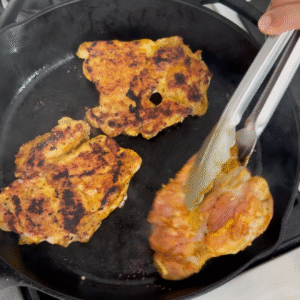 - Heat a cast iron skillet over medium-high heat. Cook the chicken in an even layer (work in batches if necessary) until it's edges get crispy, about 7 minutes per side. Transfer to a cutting board and let rest. Then cut into 1/2 inch strips. Serve immediately or save for later. This recipe can easily be used to meal prep for the week ahead.