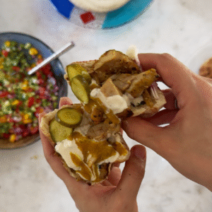 There’s nothing quite like walking through Shuk HaCarmel in Tel Aviv. The air thick with the scent of spices, sizzling meat, and warm pita fresh. That’s exactly the flavor experience this homemade chicken shawarma aims to capture. Cooked on a cast iron skillet, it brings you all the smoky, spiced, juicy goodness of shawarma without the need for a vertical spit or special equipment. It’s inspired by the kind of shawarma you’d grab after a long day wandering the shuk, wrapped in fluffy pita and topped with creamy hummus, crunchy Israeli salad, tangy cabbage salad, and a punchy drizzle of amba. Whether you’re recreating those flavors from a trip to Israel or discovering them for the first time, this stovetop version is simple, satisfying, and deeply rooted in the street food soul of Israeli cuisine.
