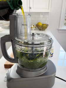 - With the processor running, slowly drizzle in the olive oil until the mixture becomes a thick, spoonable sauce. Scrape down the sides as needed.