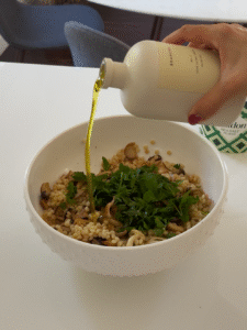 - Move mushrooms to a bowl and season generously. Do not season in the pan because this will cause them to release their moisture. Add in Israeli couscous and parsley. Season with Maldon and very fancy olive oil. Serve immediately.