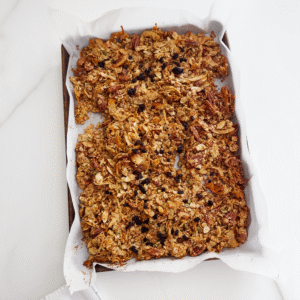 - Spread the wet mixture on a parchment lined sheet tray in an even layer. Bake in the oven for 20 minutes. While the nuts and oats bake, use your spatula to move around the mixture from the edges to the center every 5 minutes, so that it doesn't burn.