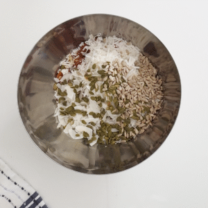 - In a large bowl, mix together rolled oats, dried coconut flakes, pecans, sliced almonds, pepitas, sunflower seeds and sesame seeds. Set aside.
