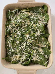 - Carefully remove preheated tray from the oven and drizzle with 2 tbsp of olive oil. Pour in spinach mixture and use a spatula to even out the edges. Top with remaining 2 tbsp of parmesan and bake for 45 minutes, rotating once for even cooking.