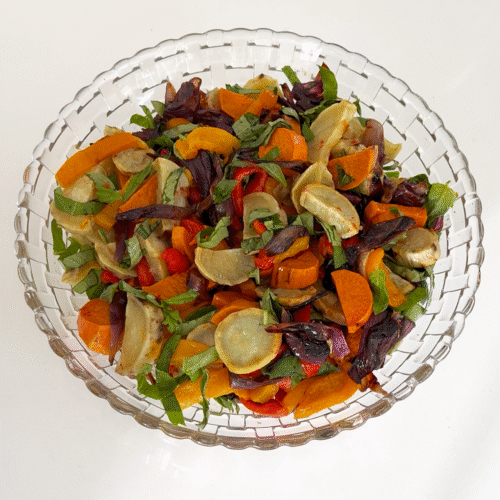 A vibrant roasted root vegetable salad made with caramelized sweet potatoes and yams, tender roasted peppers and onions, and finished with fresh basil, lemon juice, and olive oil. Simple, flavorful, and perfect served warm or at room temperature.