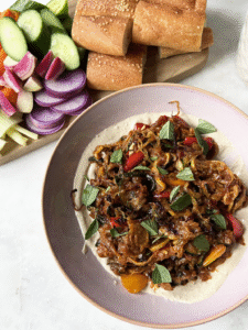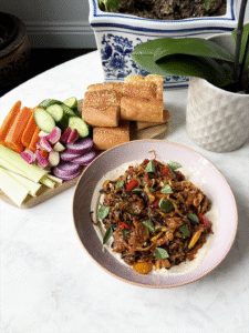 This roasted zucchini tahini dip is one of those simple recipes that feels a little more special than the effort it takes. The zucchini gets a quick roast to bring out its natural sweetness, then everything comes together on the stovetop with onions, garlic, peppers, and tahini for a rich, savory finish. A touch of tomato paste adds depth, making it perfect as a dip, spread, or side. It’s the kind of dish I love serving outside on a summer evening, with something on the grill and plenty of bread to scoop it up, easy, relaxed, and full of flavor.