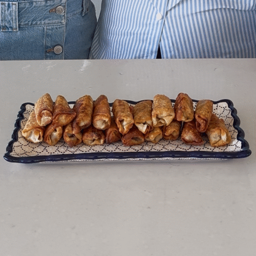 - Heat avocado oil in a large frying pan on medium heat. Add in sambusak rolls and fry about 5-6 minutes, turning once halfway through. Be careful not to overcrowd the pan. Remove from oil and cool on a sheet tray lined in paper towels. Serve immediately to keep in the fridge and reheat in the oven for guests.