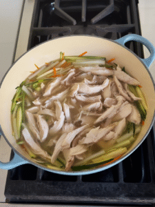 - Discard cooked vegetables and shred chicken when it's cook enough to touch.