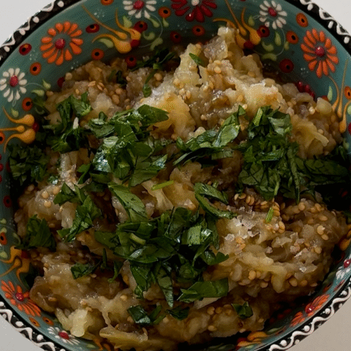 Baba ganoush has always been a staple on our family table. Growing up, my mom would make it for Shabbat, charring the eggplants right in the oven until they were smoky and tender. This version takes that same comforting dip and simplifies it even more—using a grill pan to get that rich, charred flavor in just 30 minutes. Creamy, garlicky, and topped with olive oil, Maldon salt, and fresh parsley, it’s the easiest way to enjoy a classic Middle Eastern eggplant dip at home.