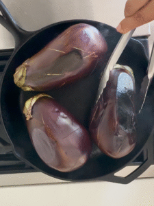 - Remove the eggplants from the heat and place them in a colander to cool and allow the bitter juices to drain out. Once cool enough to handle, scoop out the flesh and place it in a bowl. Discard the skins.
