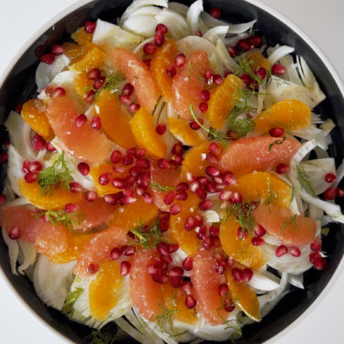 There’s something special about citrus season, the way those jewel-toned oranges and grapefruits brighten even the gloomiest winter day. This Fennel Citrus Salad is my favorite way to celebrate it: crisp shaved fennel, juicy citrus segments, and sparkling pomegranate arils all tossed with olive oil, lime juice, and flaky salt. It’s refreshing, vibrant, and maybe the prettiest way to get your vitamin C this winter. Serve it alongside roasted fish, grilled chicken, or just on its own when you’re craving something light and full of sunshine.