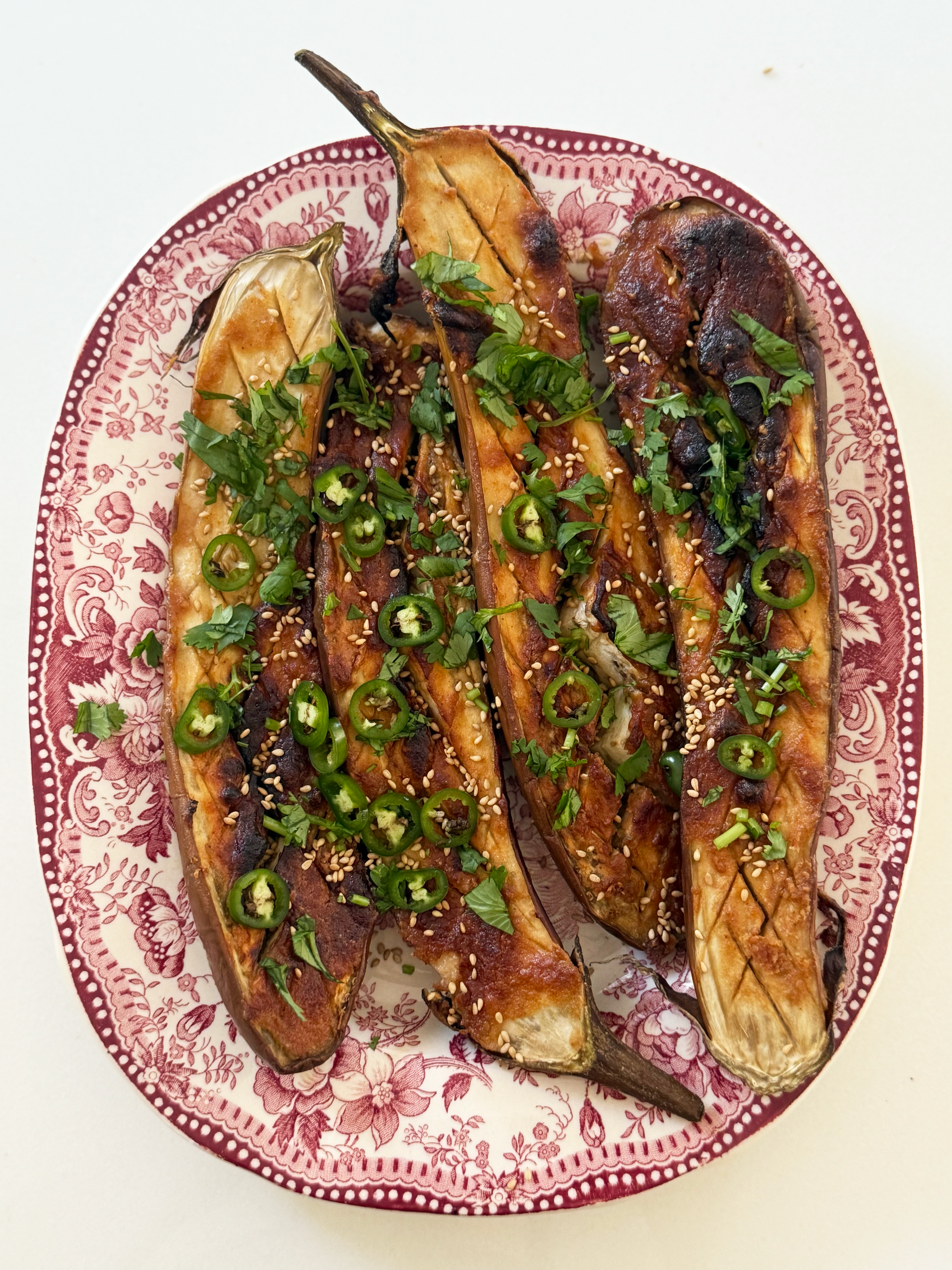 What I love most about this recipe is its balance, the creamy roasted eggplant plays perfectly against the rich glaze, while a sprinkle of toasted sesame seeds, fresh cilantro, and thinly sliced serrano peppers adds brightness and just the right kick. It’s a dish that feels special enough for entertaining, but simple enough to pull together on a weeknight.