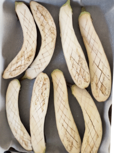 - Preheat your oven to 400°. Slice eggplants in half and use a knife to score them on a bias. Season lightly with kosher salt and arrange on a sheet tray.