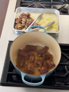- Heat the remaining 2 tbsp of olive oil in a large, heavy pot over medium-high heat. Cook the short ribs about 5 minutes, turning so that they brown on all sides. Remove the meat and set aside.